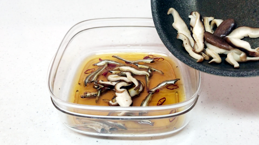 生シイタケ2枚は軸を取って、キッチンペーパーで汚れをふき取り、5ミリの厚さに切り、煮干しを乾煎りしたフライパンで、香りがするまで焼いてから、タレの中に加えます。