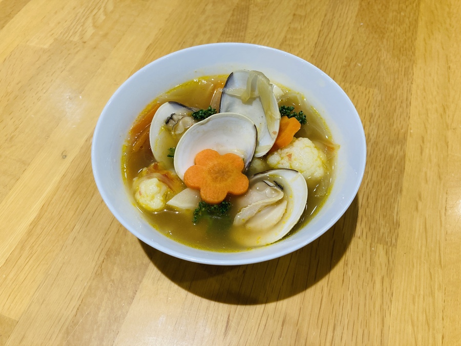 そして、水4カップと鶏がらスープの素大さじ1/2、①の蛤の蒸し汁を入れて、