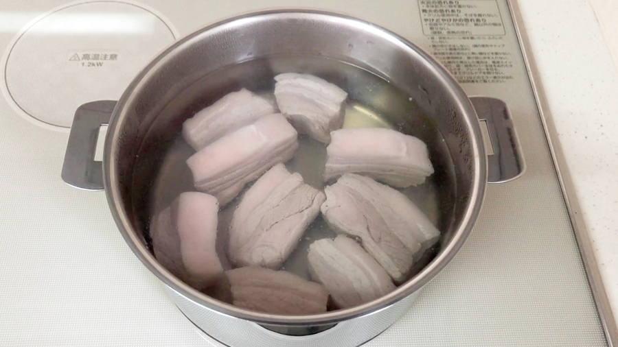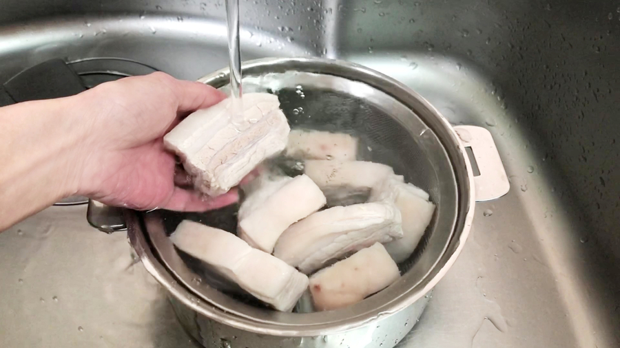 豚バラ肉を熱湯から取り出し、ぬるま湯で洗い、水気を拭きとります。