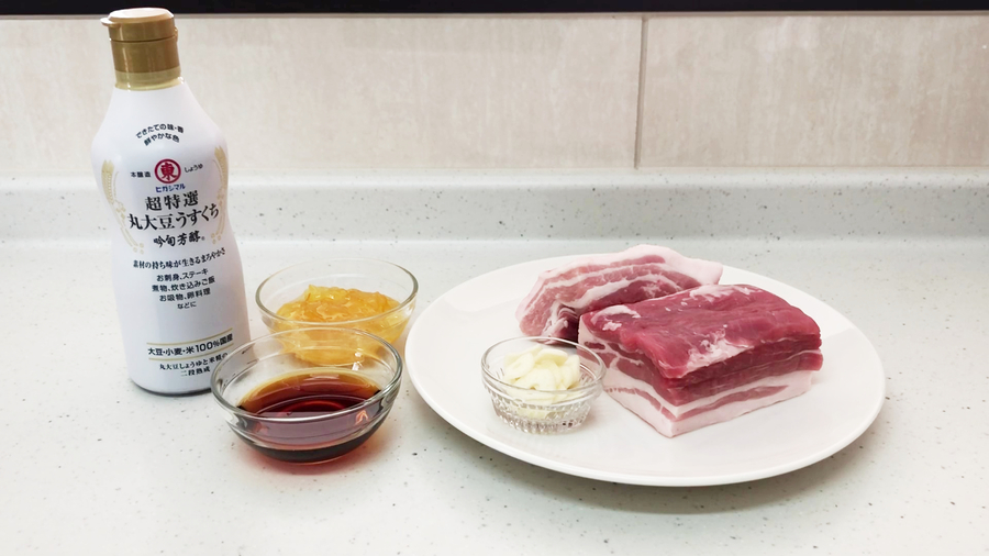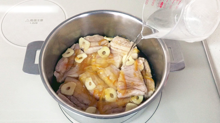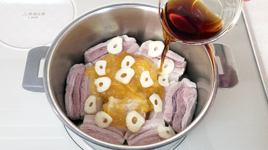 煮込み鍋(直径18cmがおススメ)にぬるま湯で洗った豚バラ肉とマーマレード80g、淡口醤油1/5カップ(40㏄)、ニンニク1かけを薄切りにしたものを入れて、よく混ぜ30分置きます(時々かき混ぜます)。