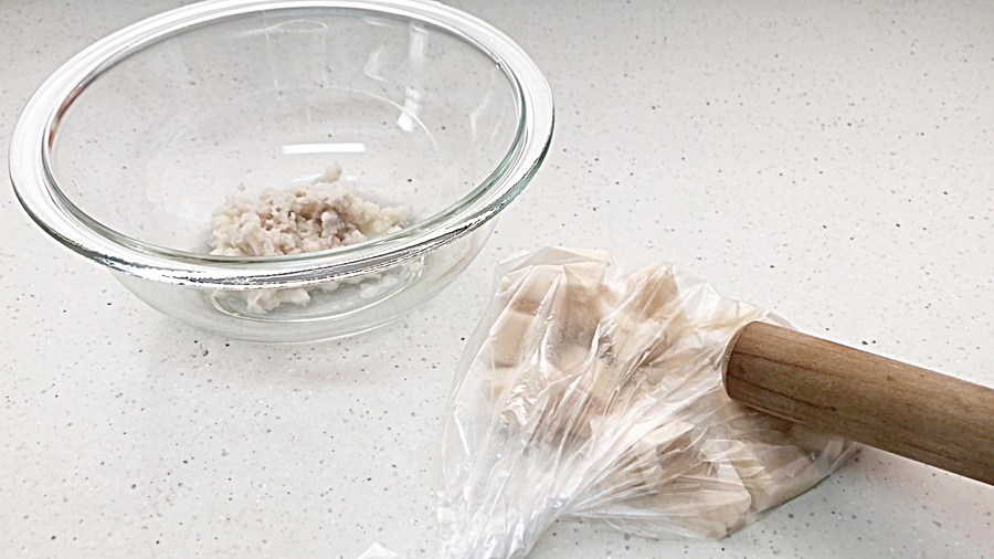 レンコン(皮をむいて)150gは、1/3はすりおろし、残りの2/3は粗く刻んで、ビニール袋に入れて、たたき砕きます。