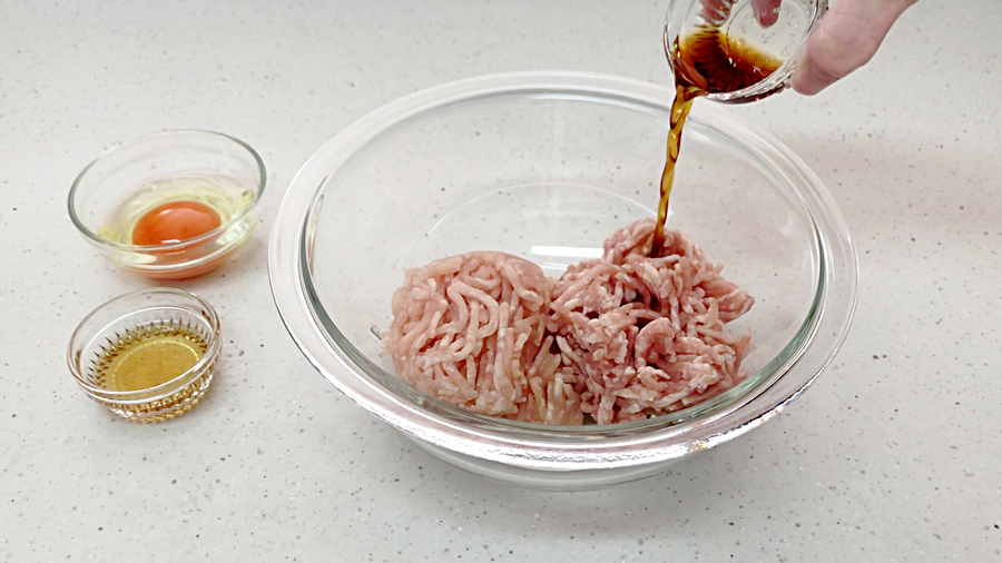 ボウルに【A】(鶏のひき肉200g、卵1個、淡口醤油大さじ1/2、みりん大さじ1/2)を入れよく混ぜます。