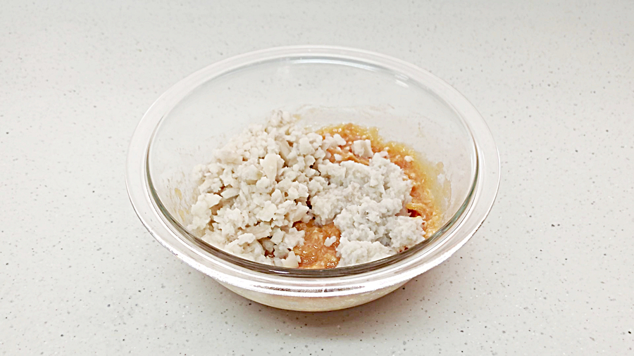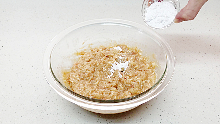 そして、片栗粉大さじ1~(ゆるかったら片栗粉を追加します)を加えて、均一になるようにさらに混ぜます。