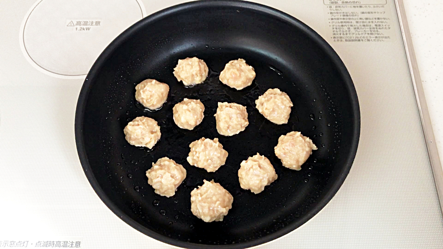 ※中火で2,3分焼くと底面が焼けるので、ひっくり返します。24個を目安につくねを作り、竹串1本につき、3個刺します。フライパンの大きさによっては2回に分けてもOKです。
