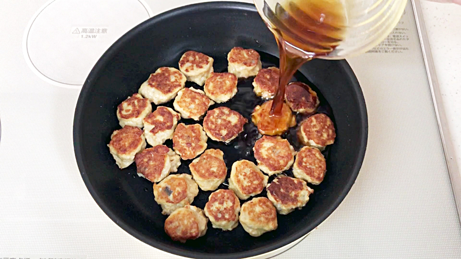 フライパンに、【B】(淡口醤油大さじ3、砂糖大さじ2をよく混ぜたもの)を回し入れ、強火でフライパンを揺り動かしながら、汁気がなくなるように照りをつけます。