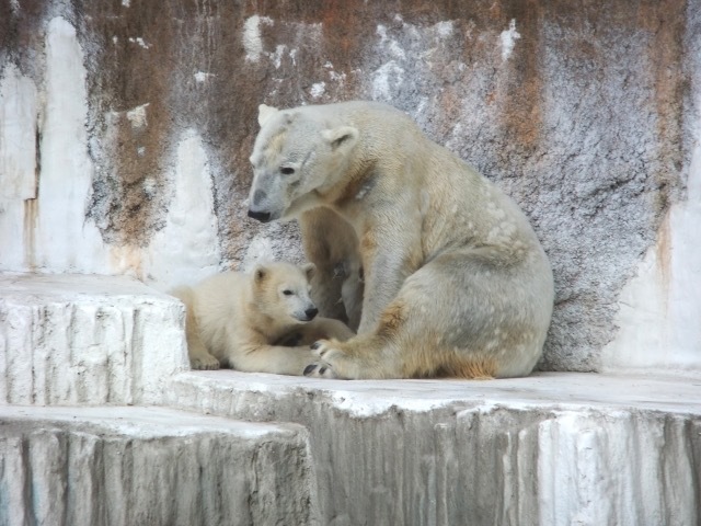 ホッキョクグマの体毛は白ですが、今までずっと産室に親子ともども籠っていたので、ちょっとベージュの濃いような色になっているそうです。