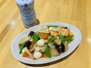 キクラゲ、タケノコ、ニンジン、(さやえんどうをゆでない場合はここで入れます)