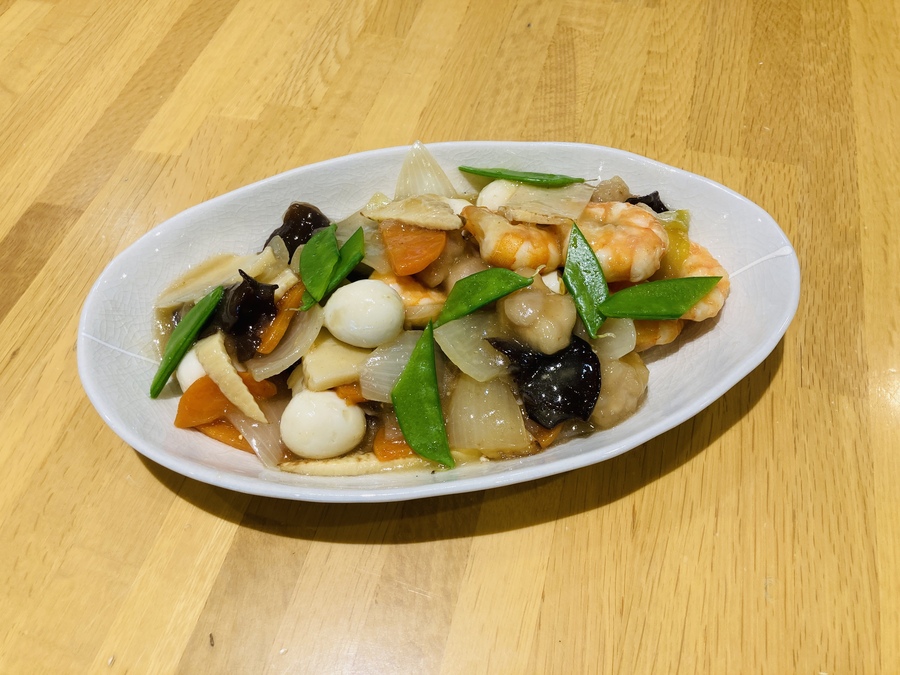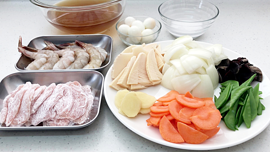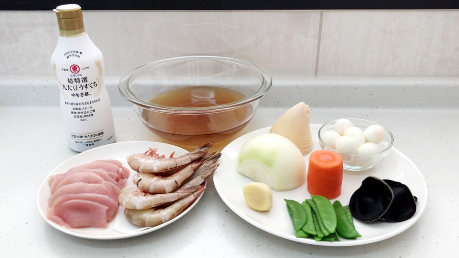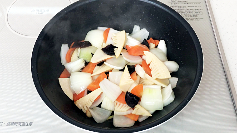 海老、鶏胸肉を炒めた鍋に油大さじ3を熱し、生姜を炒め、香りがしてきたら、キクラゲ、タケノコ、ニンジン(さやえんどうをゆでない場合はここで入れます)、タマネギの順に入れ、入れる度に軽く鍋を振り強火で炒めていきます。