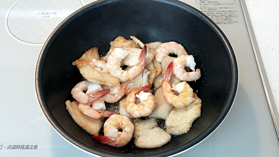 炒め鍋に揚げ焼き用の油、お玉1杯分を熱し、海老と鶏胸肉をカリッと焼き上げて、鍋から取り出します。