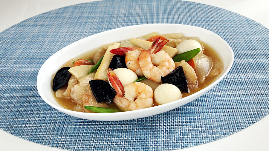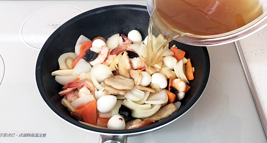 最後に入れたタマネギが半分ほど炒められたら、うずら卵と海老、鶏胸肉も入れ、【B】の合わせ調味料を入れ、味を調えます。