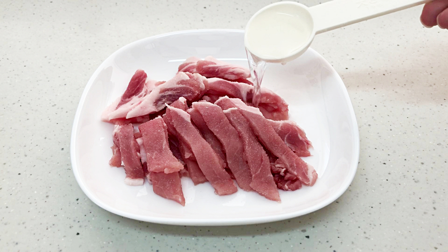 豚肉100gは1センチ幅に切り、【A】(塩少々、酒大さじ1)を振りかけ、5分くらいおいて、下味をつけます。そのあと肉をほぐします。
