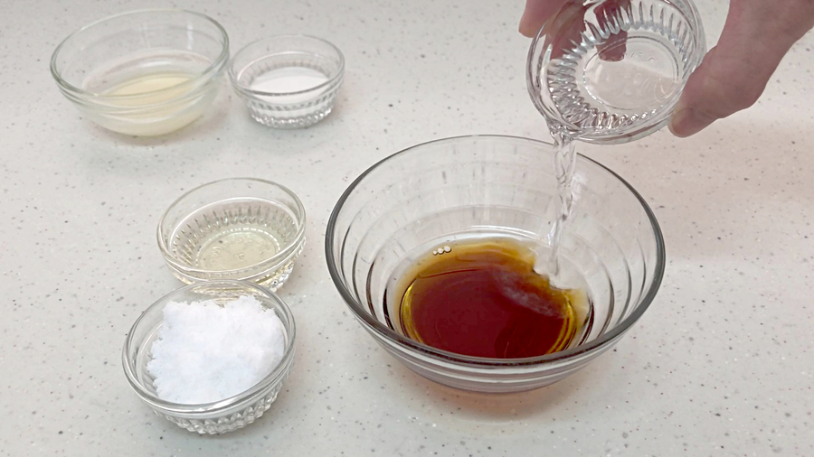 水大さじ2、鶏がらスープの素小さじ1/2を合わせて【B】を作り、淡口醤油大さじ2、酢大さじ1、酒大さじ1、砂糖大さじ1と1/2を合わせて【C】を作ります。