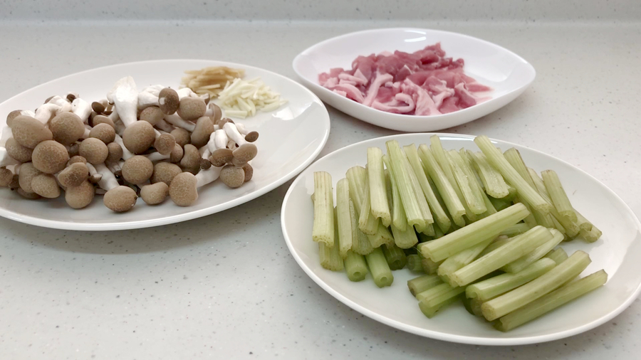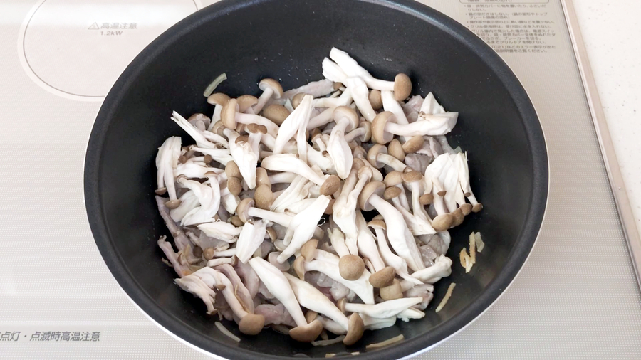 炒め鍋に油大さじ2を熱し、ニンニク、生姜を炒め、香りが出てきたら、少し火を弱め、豚肉を入れ、肉に火が通ったら、シメジを入れ、1分ぐらい炒めます。