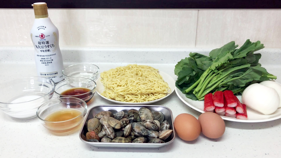 焼いた焼きそばの麺に一つ前の工程で作ったあんをかけ、取り出しておいたあさりを散らします。