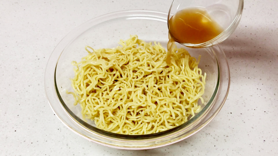 焼きそば麺2袋は袋から出してザクザク切り、パラパラにほぐし、【A】(淡口醤油小さじ1、鶏がらスープの素小さじ1/2、水大さじ2)を均一に振りかけ、5分くらい置きます。