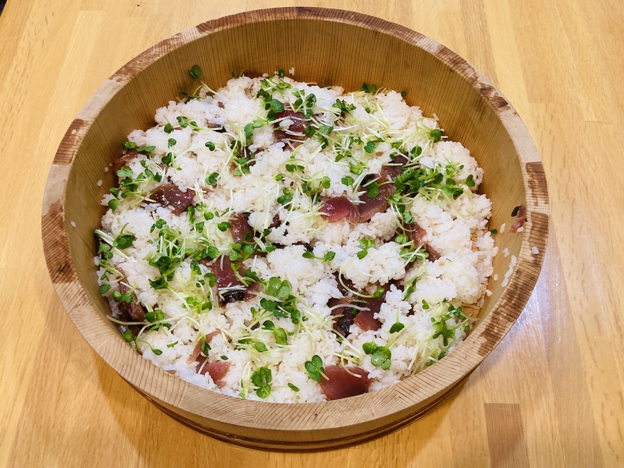 すし桶に漬け込んだカツオを入れ、全体にいきわたるように混ぜて、小口切りのカイワレ大根1パックを散らしたら完成です。