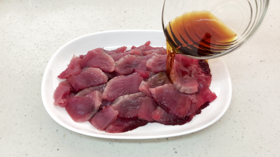 カツオ200gは小さめのそぎ切り、もしくは、さいの目に切り合わせ、【B】(淡口醤油大さじ2、酒大さじ1/2、みりん大さじ1/2)に2時間以上漬け込みます。