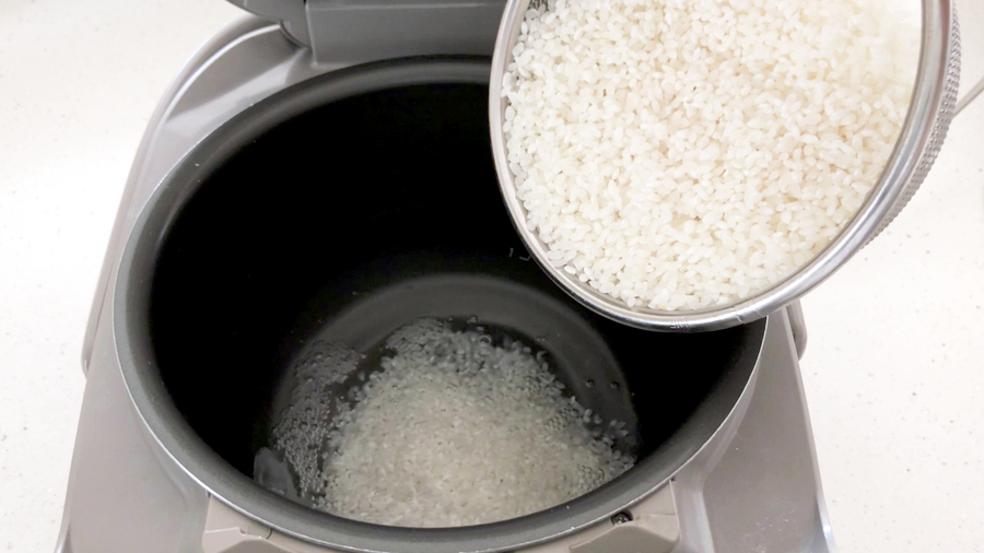 そのあと、炊飯器の内釜に米、水400~440㏄と酒大さじ2を入れて炊きます。