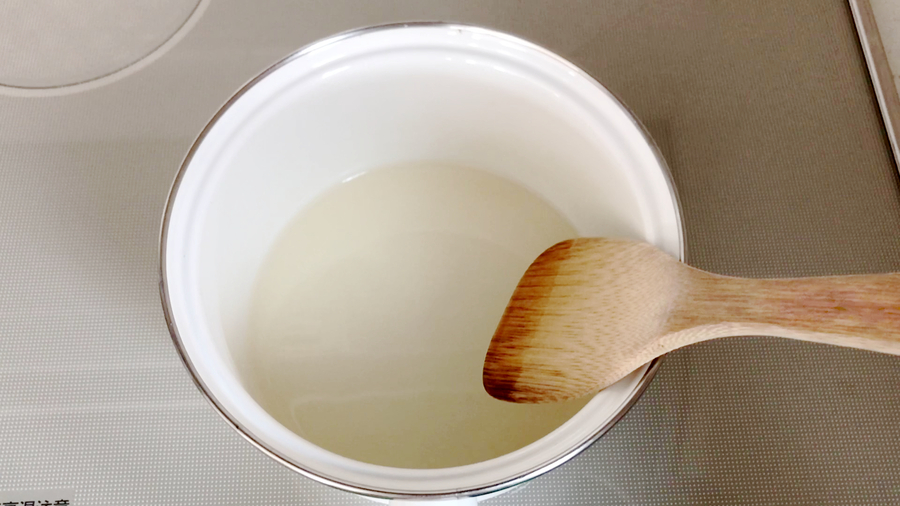 【A】(酢60~75㏄、砂糖大さじ1と1/2~3、塩大さじ3/5)の合わせ酢を小鍋に入れて、弱火で沸騰させないように加熱し、砂糖と塩を酢に溶かしたら冷まします。