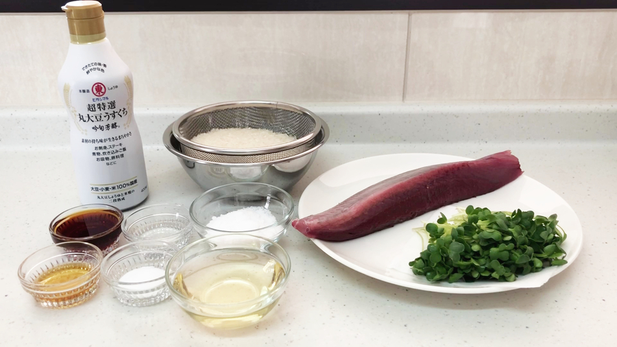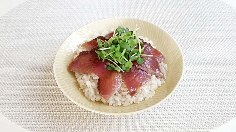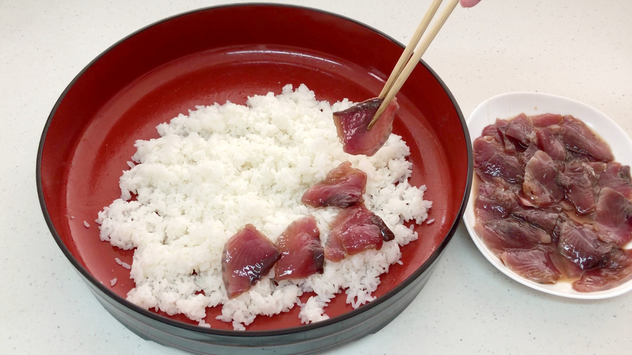 *カツオを醤油で漬ける際に倍の量(大さじ4)にして、そのつけ汁をご飯に混ぜても良いです。その際には合わせ酢の塩は抜きましょう。