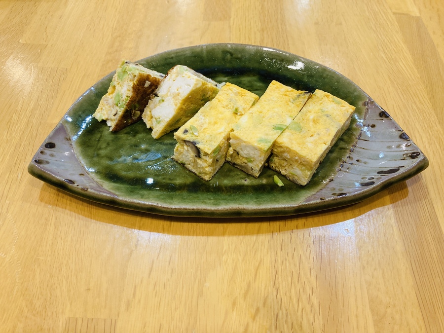 ②干しシイタケ1枚は水で戻したあと、細く切ります。枝豆30gは茹でて、