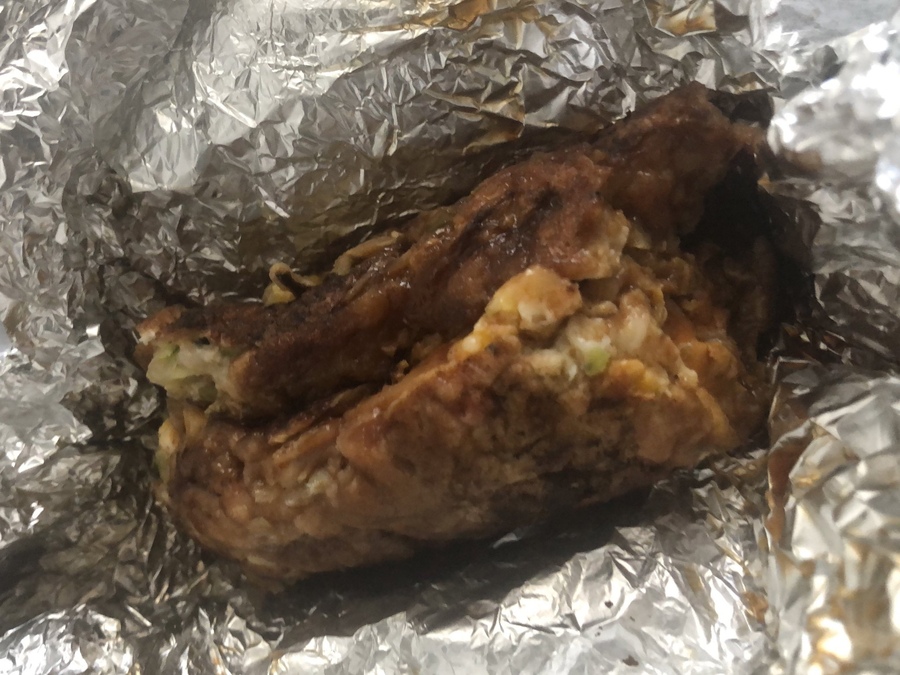 そして売り方にも特徴があり、お好み焼きを半分に折って紙やアルミホイルに包んだものを提供します。