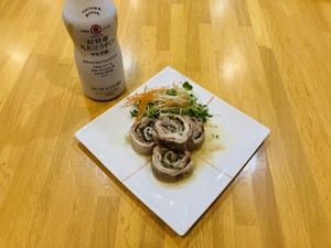 ロール豚肉は食べやすい大きさに切り、付け合わせの野菜、大根の千切り150g、