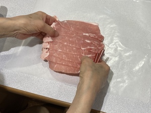 豚肉をきれいに並べて、手でギュッギュッと押して、肉を引き延ばして大きくします。