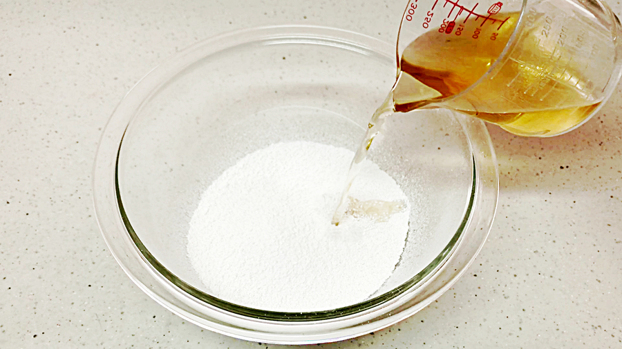 白玉粉100gをボウルに入れ、冷ました【A】を加えながら手でこねていきます。