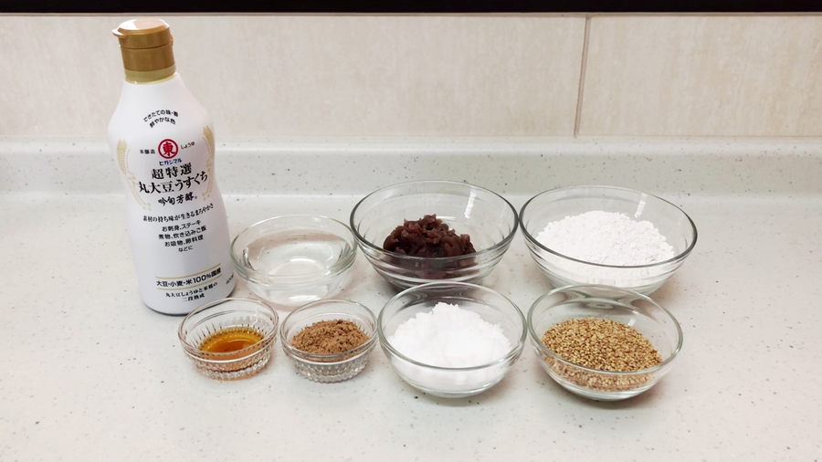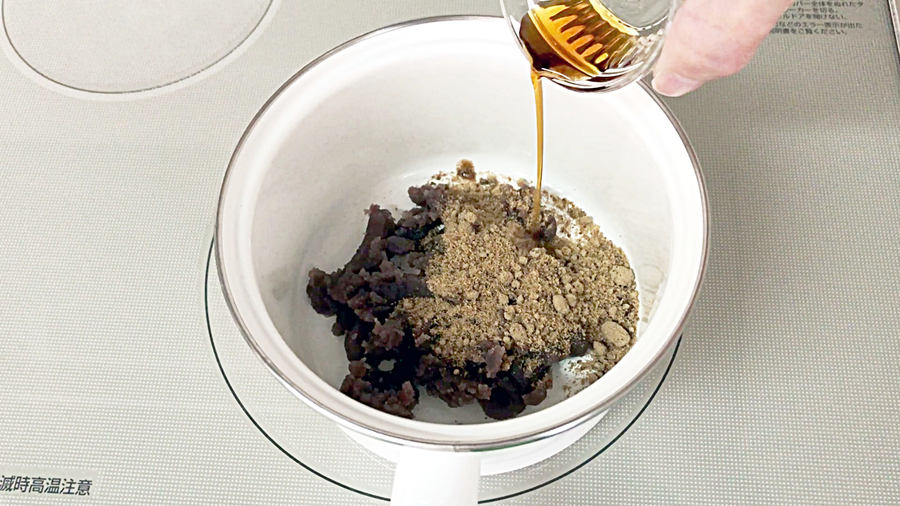 こしあん100g、淡口醤油小さじ1、黒砂糖大さじ1を鍋に入れ、中火で3~4分かき混ぜながら煮詰めます。鍋から離れるようになったら、火を止めて、これも6分割に丸めてから冷ましてください。