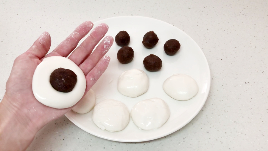 白玉粉の生地を直径5センチくらいの円形に伸ばし、その上にあんを直径4センチくらいの円形に広げて、白い皮の部分を真ん中に合わせるように包み、手のひらにのせてコロコロ転がして、球形にします。