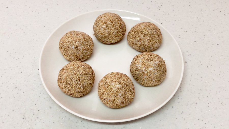 *団子が乾いてに炒り胡麻がつかない時は表面を濡らしてください。