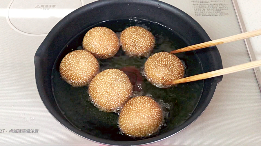 揚げ油を170℃に熱し、団子を全部入れてから、火を止めてください。