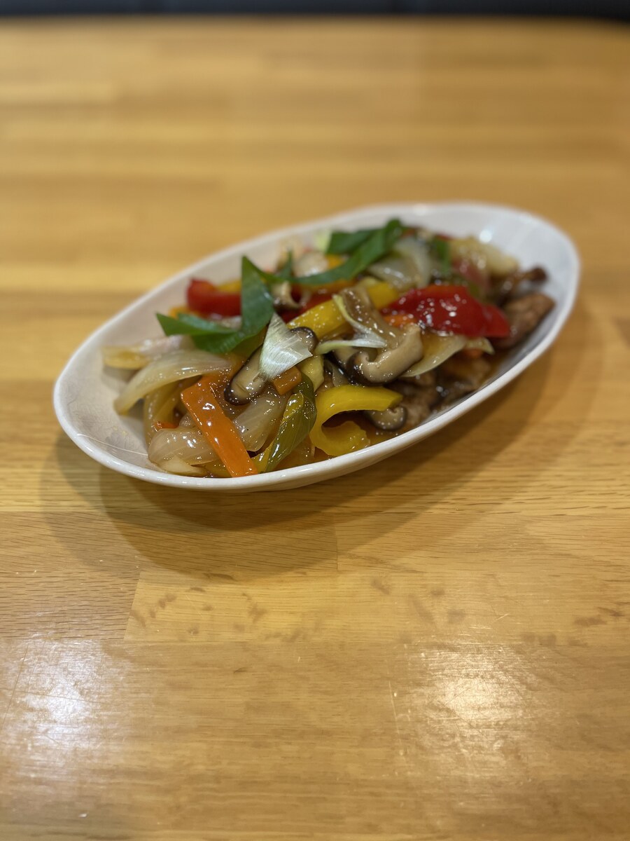 油を切り皿に盛ります。炒め鍋の油はふき取ります。