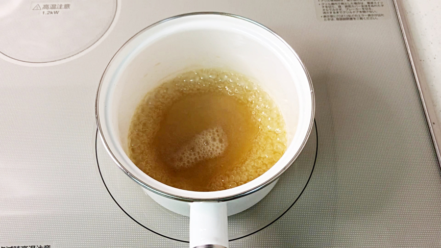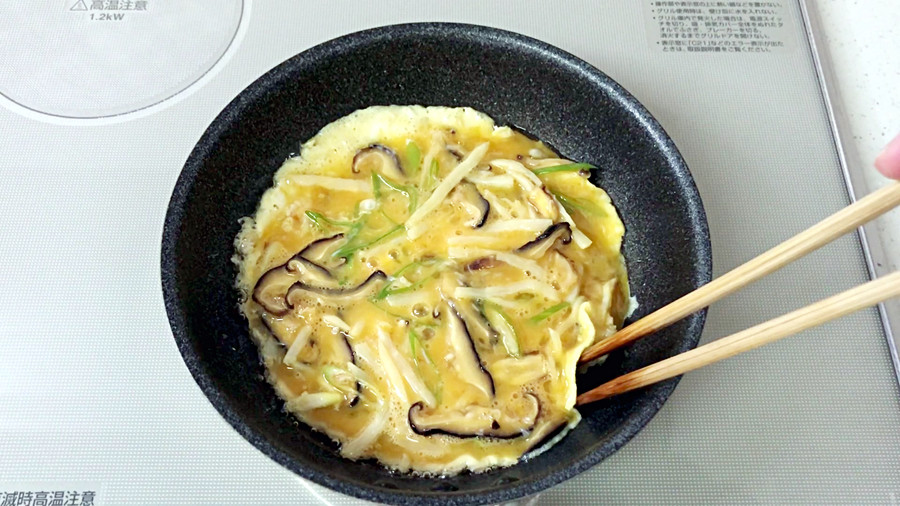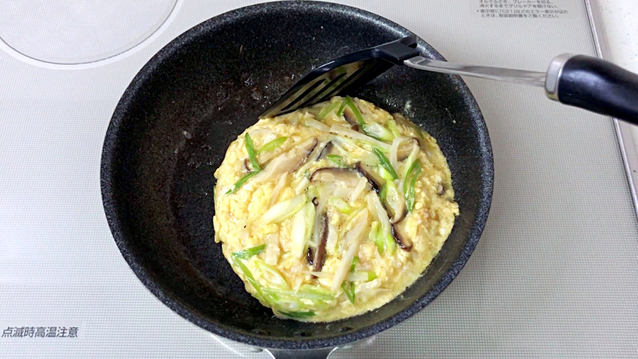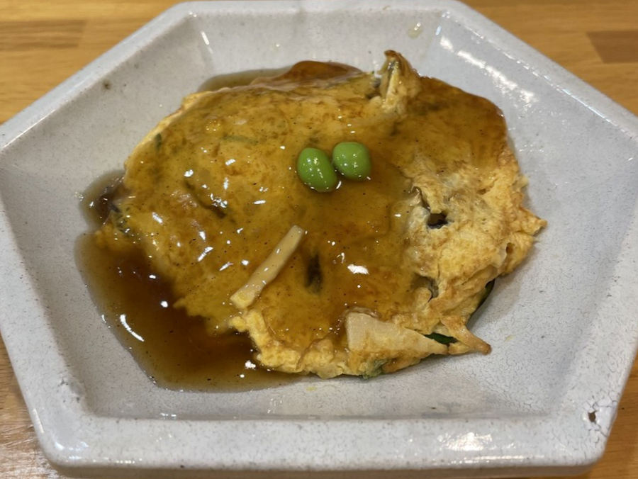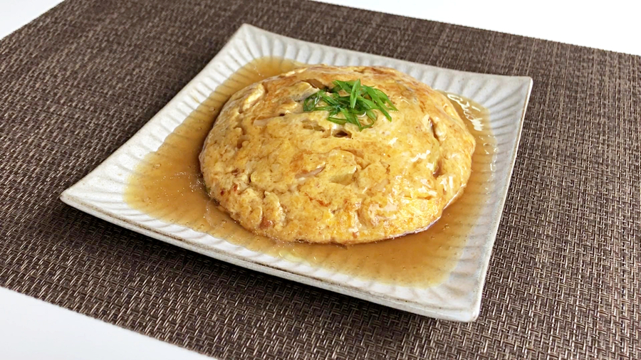 透明感がでてきて、とろみがついたら卵と具材を合わせて焼いたものにかけて完成です。