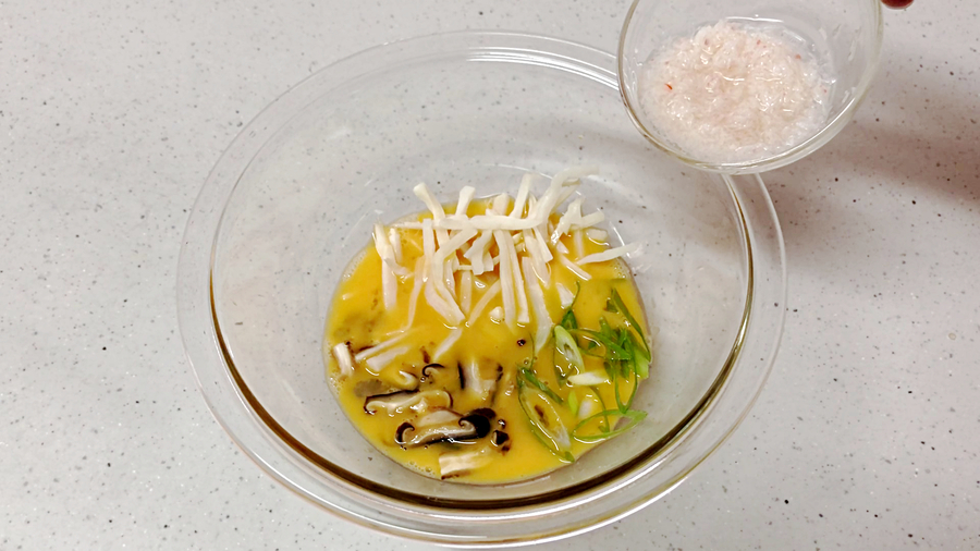 溶いた卵、シイタケ、タケノコ、ネギと小さめのカニ缶1/2とカニ汁も合わせます。