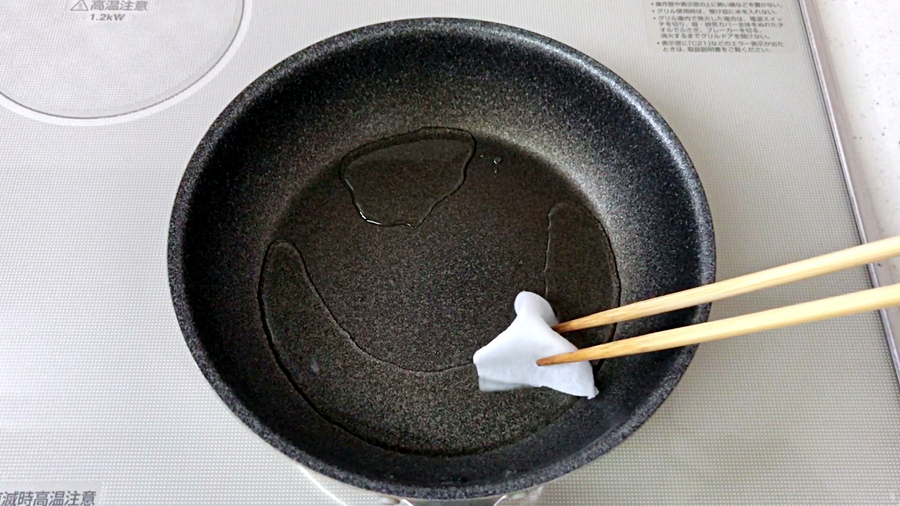 油をフライパンに入れて、1分くらいかけて熱したら、表面をふき取りつつ、油をなじませます。