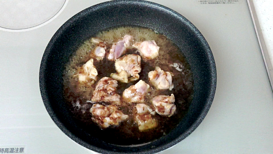 小さいフライパン(もしくは鍋)に煮汁1人分を入れて、煮立ったら、鶏肉(75g)を入れ、中火で一煮立ちさせてアクを取ります。