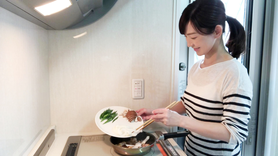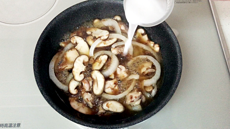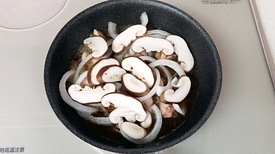 鶏肉に火が通ったら、1人分のタマネギ、シイタケを入れて1分ほど煮ます。