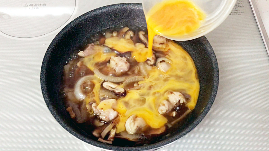 煮立っているところに溶き卵2個分を外から円を描くように流し入れ、具材の外回りから鍋を2~3回大きくかき混ぜ、半熟のふわふわ卵を作ります。