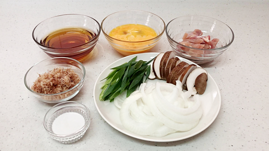 生シイタケはうす切り、ネギは5ミリ幅の斜め切りにして、切った具材をそれぞれ1人分ずつに分けておきます。