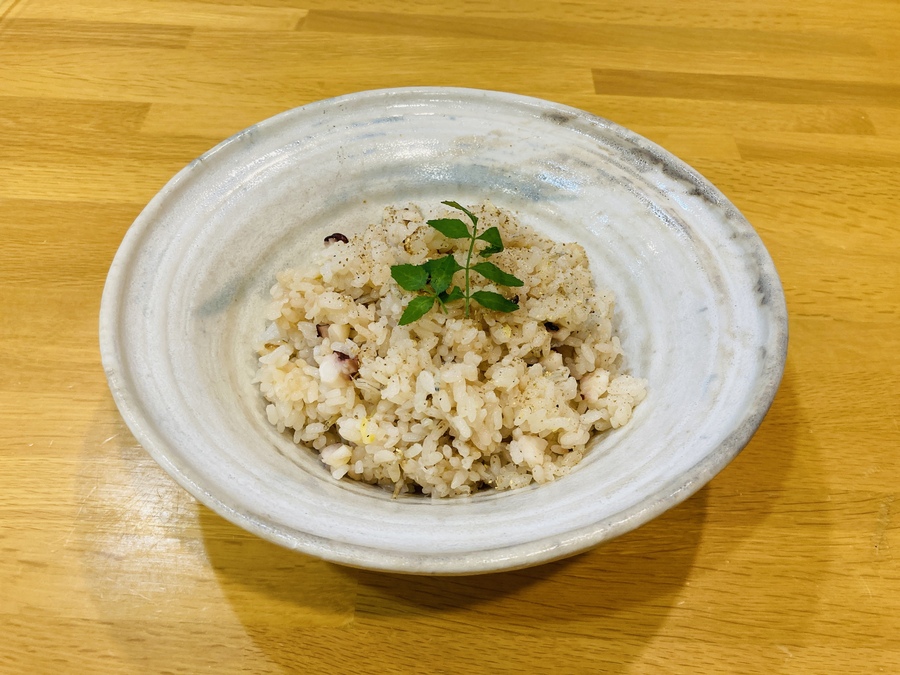 ②を入れ1分ぐらい中火で炒めたら、①を入れて弱火にして米が透き通り、