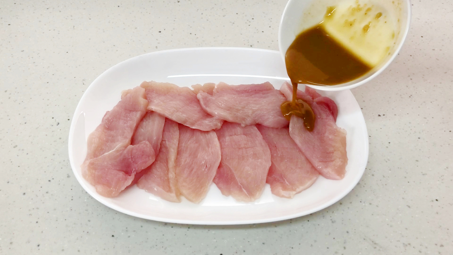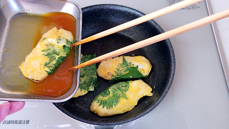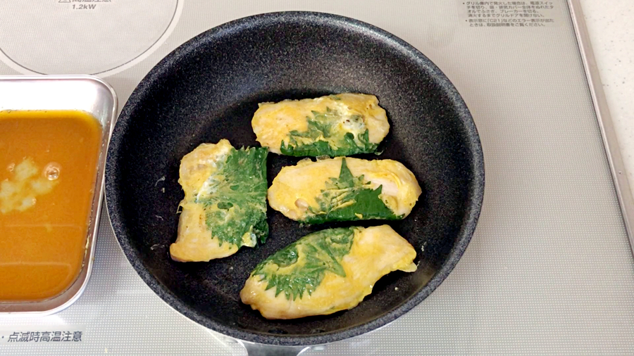 熱したらいったん火を止めます。鶏胸肉を卵液にくぐらせたものをフライパンにおいて、余分な油はふき取り、火をつけて、弱火で1分焼いたらひっくり返して、もう1分焼き、火を止めます。