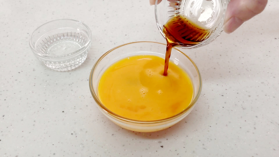 【B】の卵1個とさらに卵黄1個をよく溶きほぐし、酒大さじ1/2と淡口醤油小さじ1を加えてよく混ぜ、卵液を作ります。