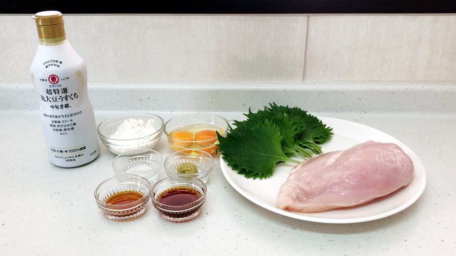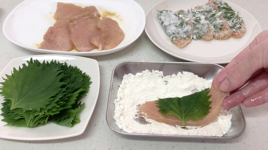 大葉12枚~は軸をつまみ取り、ポンポンと叩いて香りを出してから、鶏胸肉を包み、薄力粉適宜を薄くまぶし、余分な粉は落とします。