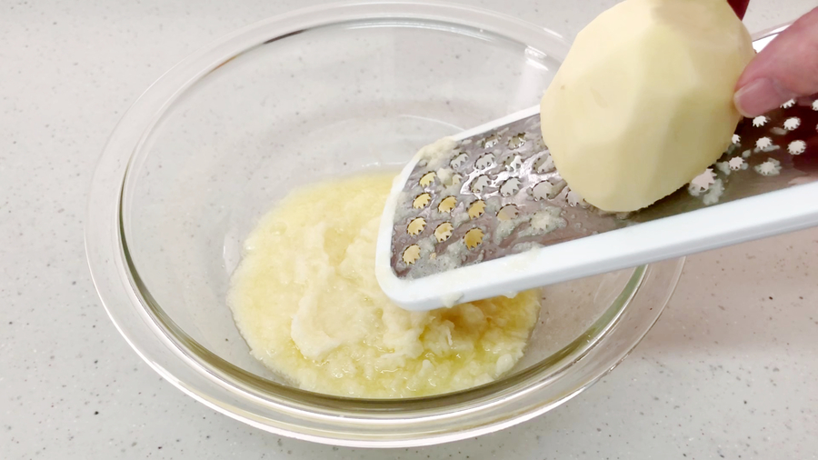 ジャガイモ3個(300g)は皮をむき、水に少しさらしたら、おろし金ですりおろします。