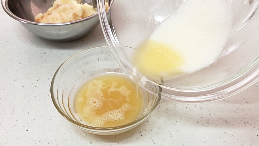 でんぷんが必要になりますので、ボウルのなかで軽く絞り、ジャガイモと絞り汁に分けます。絞り加減はハンバーグ生地くらいの固さで絞ります。