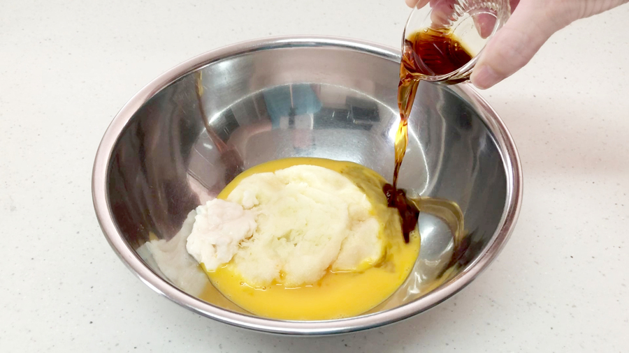 ボウルに絞ったジャガイモと、絞り汁からとったでんぷんを入れ、卵1個は溶き卵にして入れ、淡口醤油大さじ1を入れて、よく混ぜ合わせ、生地の出来上がりです。