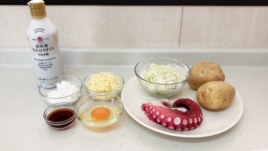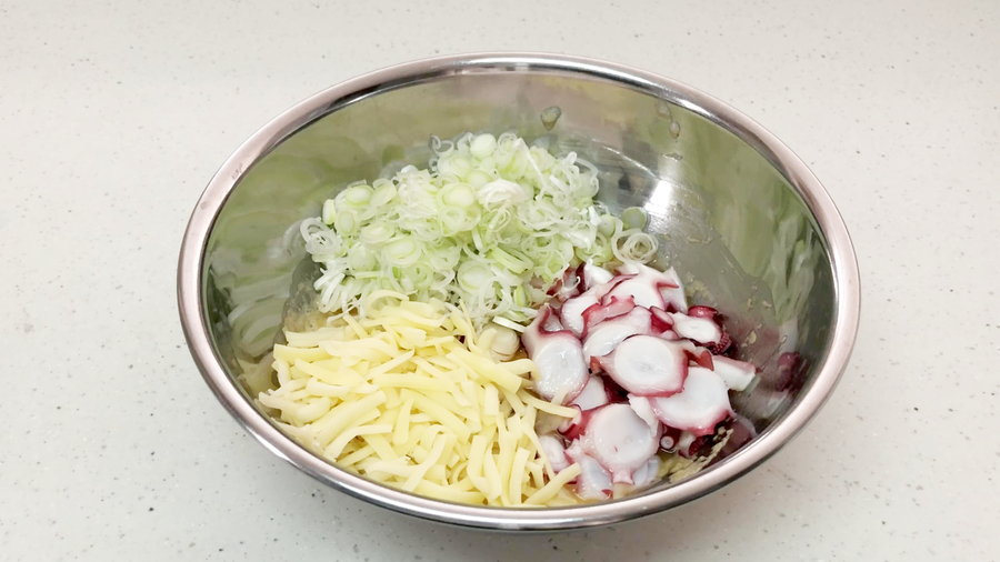 蒸しダコ100gはうす切りにし、ネギは小口切りにして、とろけるチーズ50gを生地に混ぜます。