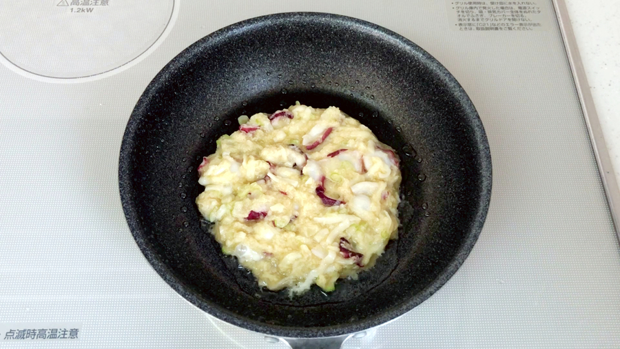 熱したフライパンに、1/4量の生地を流し込み、強火にして丸く形を整えます。